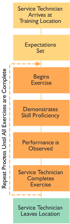The enrolled service technicians will meet at the training location for the Certification Assessment. Below is a flowchart and explanation of what will take place: