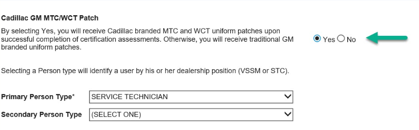 On the Profile page, a new setting should appear: Cadillac GM MTC/WCT Patch. This setting has two radio button options “Yes” or “No.” By selecting “Yes,” the technician will receive Cadillac-branded MTC and WCT patches upon successful completion of a certification assessment (assuming the corresponding ASE certification requirement has been met as well). The setting will only appear for those at Certified Cadillac Dealers.